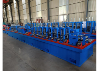 高频焊管机是以带钢为原料,经开卷、成型、高频焊接、解决焊瘤、定径、校直、切断等一系列制管工序制造出圆钢管或各样式一行钢管的成套设备。采用辊式成型将带钢冷弯加工成圆坯,通过高频感应加热将焊缝挤压形成圆管,在经过定径加工生产出各样式标准规格的圆管、方矩形管。