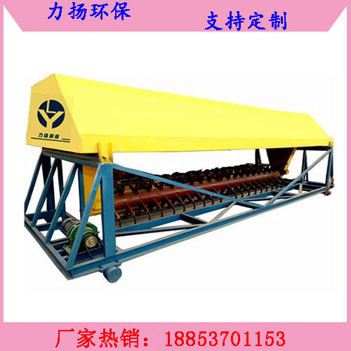 轨道式翻抛机在发酵槽上进行工作任务,通常采取电初驱动。因为轨道式翻抛机滚筒的高速旋转,滚筒上的刀片对发酵槽内发酵物料进行破碎、混杂搅拌,同时物洲波滚筒向后翻抛并杜准稚置。通过电动传动安装,轨道式翻抛机能够完成滚筒主动升降、转动。轨道式翻抛机通过移行车完成从一个发酵槽到另一个发酵槽的移行,多个发酵槽能够采取一台槽式翻堆机。