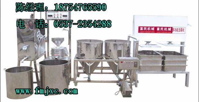 专业生产加工全自动富民牌不锈钢豆腐机济宁富民机械厂豆腐机,可同时生产果蔬彩色豆腐系列产品单色豆腐,多彩豆腐 单色,豆腐皮 ,富民牌多功能彩色豆腐机多色豆腐皮 彩色豆腐干 ,多彩色素鸡 ,豆浆 ,豆腐花等豆制品制作,还可以与其,他设备和工艺配套生产更多的豆制品。济宁富民机械厂豆腐机洁净卫生:符合国家食品卫生标准的不锈钢生产设备,整洁光滑易清洗,在加工全过程中,地面无水作业,环境清洁卫生。富民牌豆腐机全自动不锈钢小型豆腐机,方便快捷:采用自动放浆,无需用泵吸出,节省占地面积及减少故障点,点脑桶为活动式,简捷方便,省时省力,从原料进机到出成品。