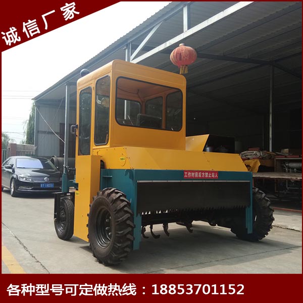 自走式翻抛机采取四轮行走设计,可前进、倒退、转弯,由一人操控驾驶。行驶中整车骑跨在予先堆置的长条形肥基上,由机架下挂装的旋转dao轴对肥基原料实施翻拌、蓬松、移堆,车过之后篡成新的条形垛堆。地面堆置发酵需将物料堆成长形条垛,由轮式翻抛机定时对物料实施搅拌、破碎,在好氧条件下进行有机物的分解。并且有破碎的功能,大大节省了时间和劳力,使有机肥厂生产效率和产品质量有显著提高,成本大大降低。