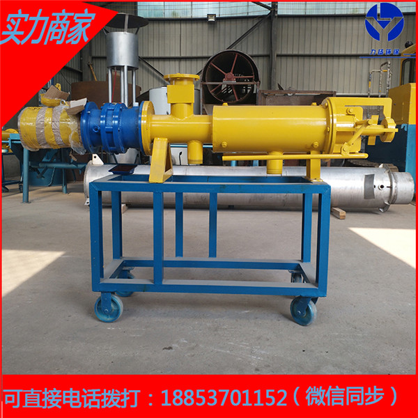 工作原理:由配套的无堵塞液下泵将畜禽粪便提升送至固液粪便脱水机内,再有绞龙将畜禽粪便逐渐推向机器的前方,同时不断提高机器前缘的压力,迫使物料中的水分在边压带滤的作用下挤出网筛,流出排水管。鸡粪干湿分离机的工作是连续进行的,其粪水不断地提升至干湿分离机内,前缘的压力不断增大,当达到一定程度时,就将出料口顶开并挤出挤压口,达到挤压出料的目的。为了掌握出料的速度与含水量,可以调节主机下方的配重块,已达到满意适当的出料状态。