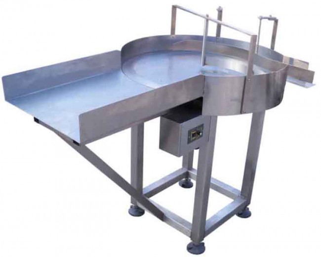 通过转盘的旋转,使得瓶子在旋转切向力作用下按序进入输送带,进而完成向其他设备输送瓶子的一项辅助性工作。