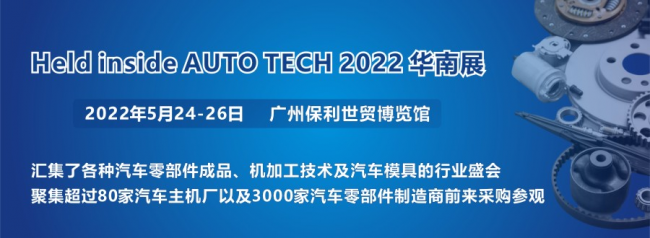 第九届广州国际汽车零部件及加工技术/汽车模具技术展览会是AUTO TECH 2022 华南展重要组成部分,将于2022年5月24-26日在广州保利世贸博览馆举办;展品覆盖汽车发动机/底盘/变速箱/车身部件产品及半产品、汽车零部件的冲压加工、钣金加工、铸造/锻造、表面处理/热处理、切割/研磨加工、树脂成形;加工设备磨具、塑料模具、自动化及检测设备、模具相关配套等,是华南地区专业的汽车零部件及加工技术展,也是您拓展在汽车行业的业务量和影响力的z佳商务平台!